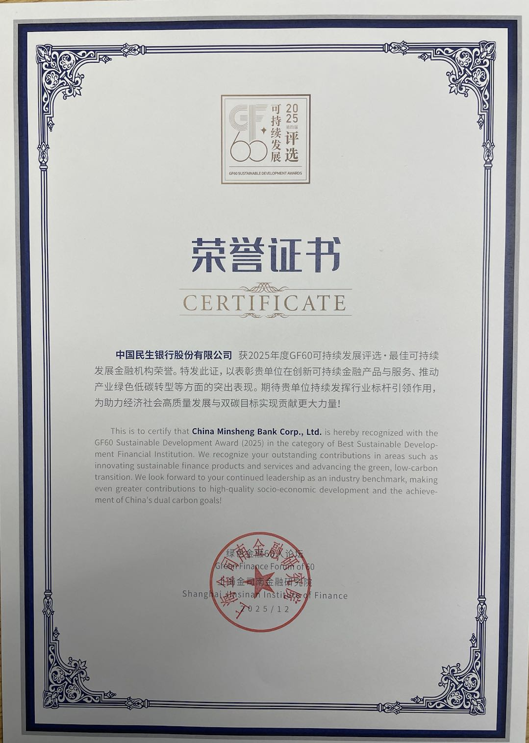 民生银行获2025年度GF60可持续发展评选 最佳可持续发展金融机构荣誉